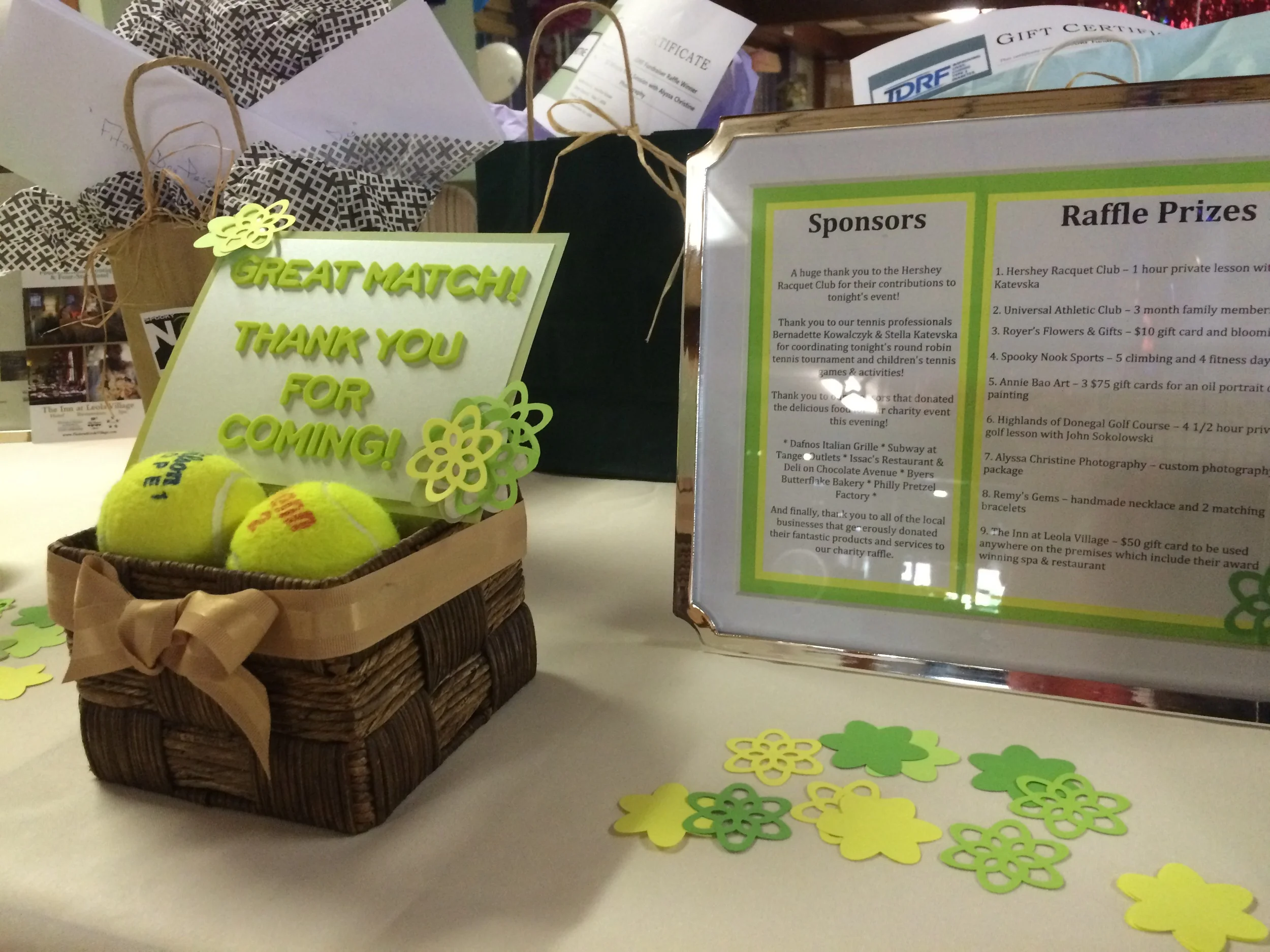 When brainstorming ideas for our fundraiser, our goal was to think outside the box, and organize a different kind of event. Instead of the typical charity run/walk, we thought a tennis round-robin tournament would be great way to raise funds and awareness while staying active and having fun. We approached the Hershey Racquet Club who was gracious to donate all 8 of their indoor tennis courts and their party room for the evening. Two USTA tennis professionals who work at the club also donated their time and expertise to run a round-robin tennis tournament and children's lessons and games. For those in attendance who did not want to play in the tournament, instructors were on hand to oversee a variety of games which included corn-hole boards and games of can-jam. Following the tennis round robin and games, our guests mingled, enjoyed food and drinks and took part in our wonderful raffle. We were delighted when local businesses and restaurants donated food, drinks and amazing raffles prizes for the event which helped make it a huge succcess.